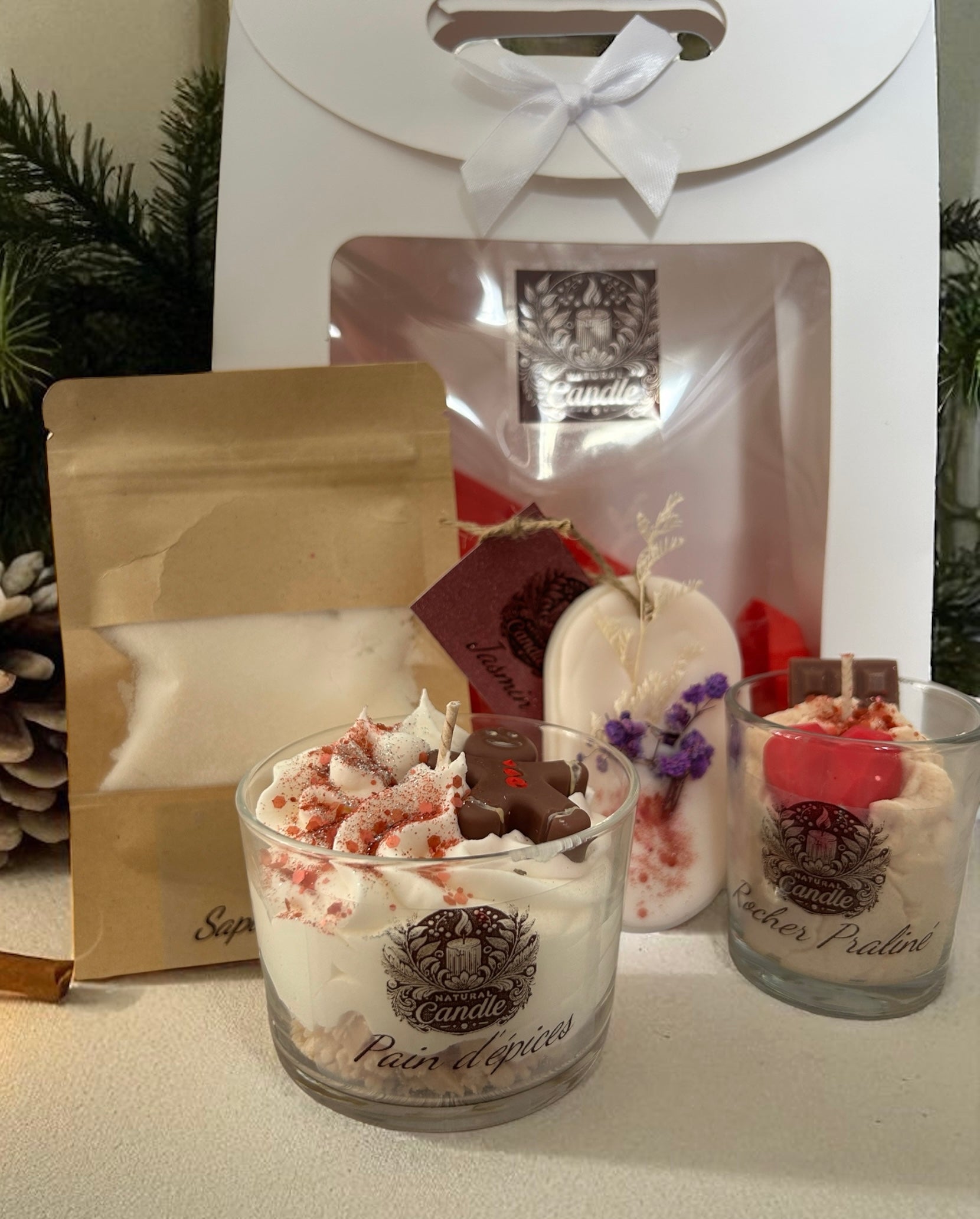 Personnalisez votre coffret de bougies à offrir en choisissant une grande bougie, une petite bougie de Noël, une poudre parfumée ainsi qu’une suspension parfumée.